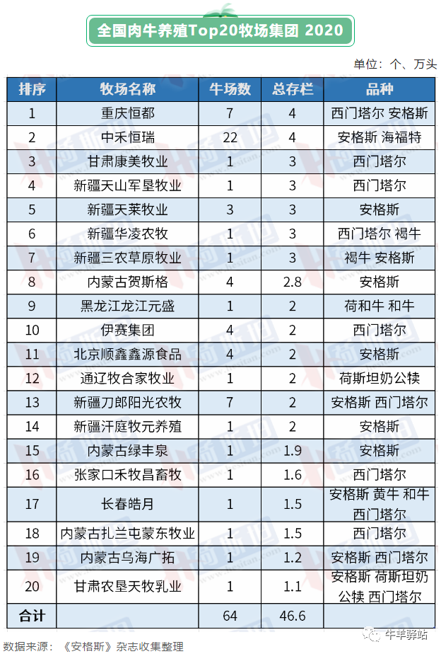 2020年中国存栏最多的20个规模牧场主要分布在西南、西北以及东北三处,总存栏46.6万头,分布在64个牧场中。其中西南地区2个牧业集团8万头,西北地区15个牧业集团15万头(包括内蒙),东北地区2个牧业集团3.5万头。